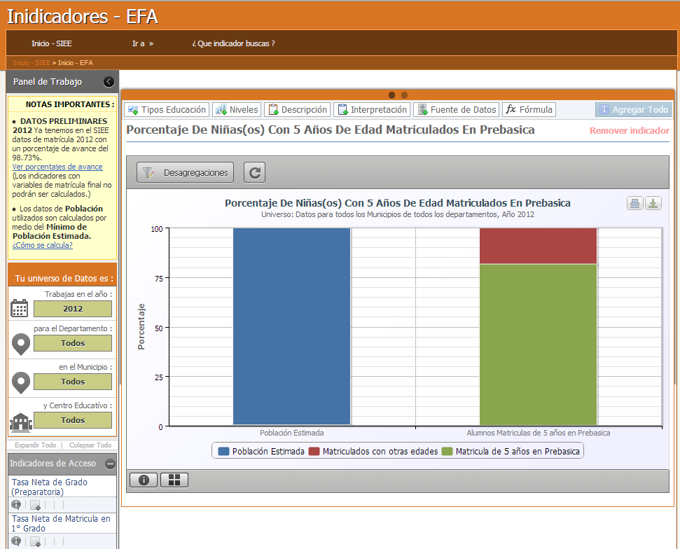 En este sitio encontrará los indicadores de seguimiento de las metas Educación Para Todos (Education For All, E.F.A.); llegando hasta el nivel departamental.